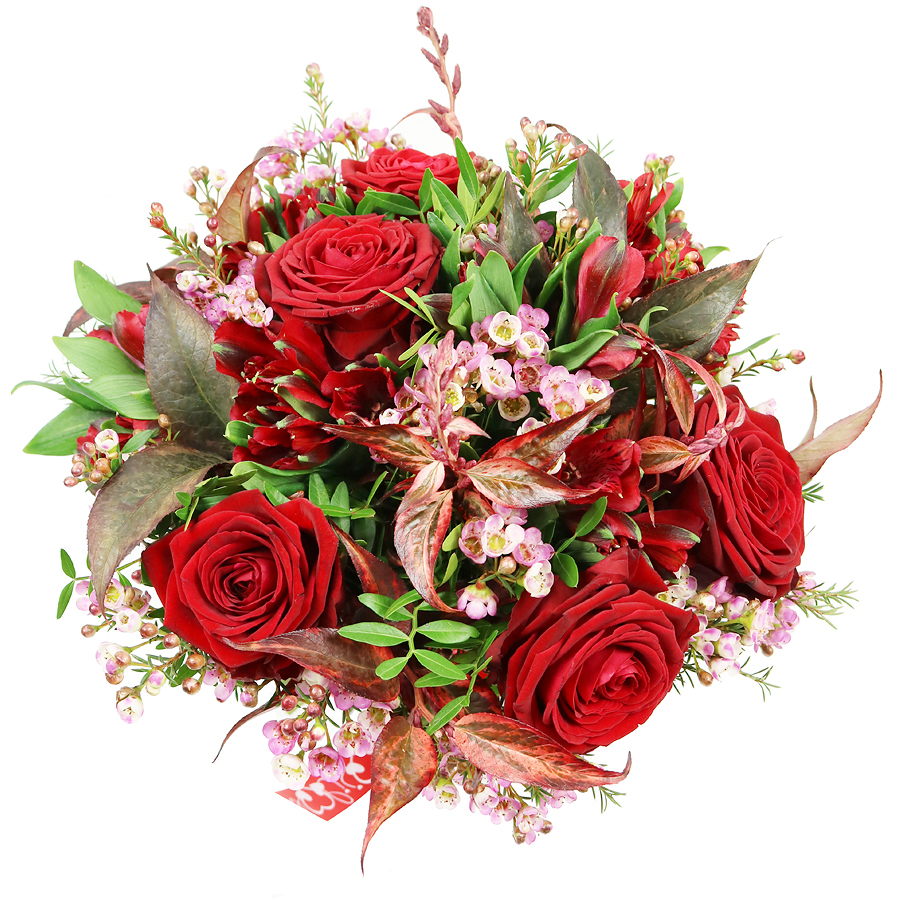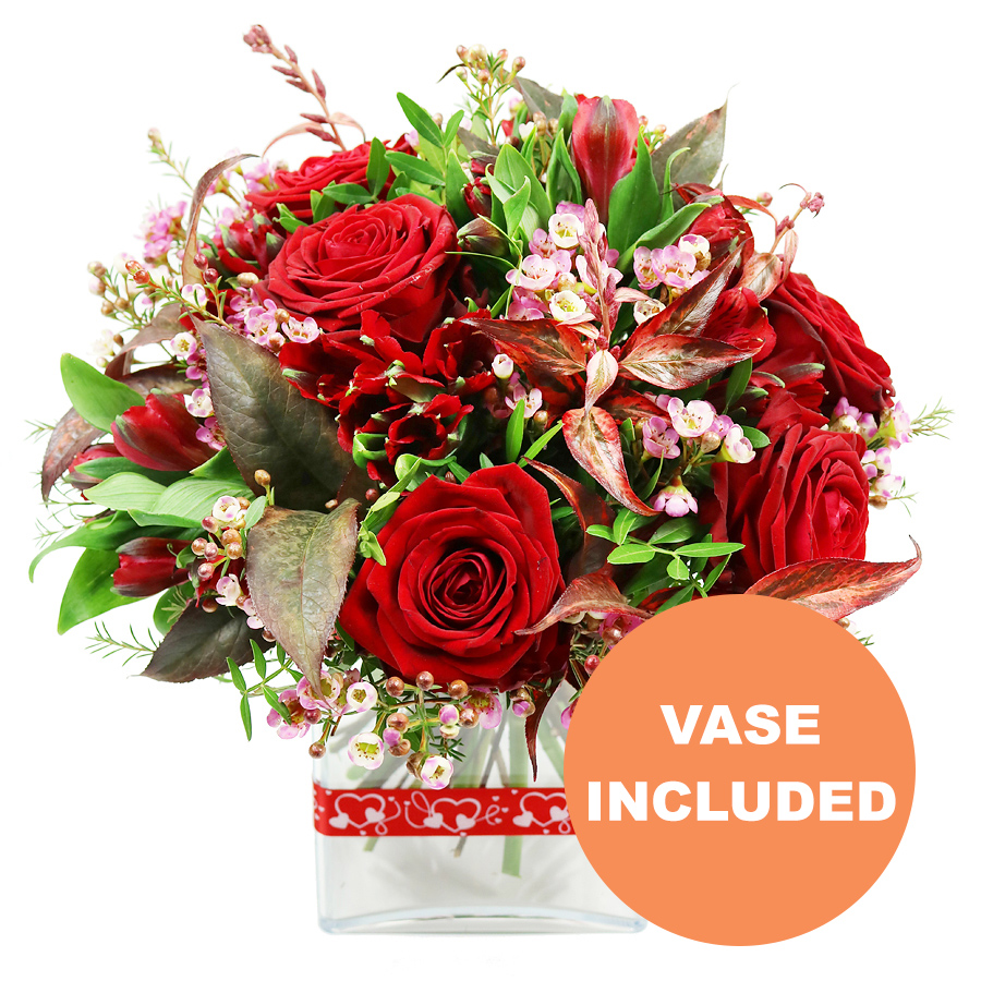 Discover the stunning elegance of our Radiant Red Harmony Bouquet. This exquisite arrangement showcases deep red roses, vibrant red alstroemeria, charming wax flowers, lush pistacia, and elegant red greenery, all meticulously combined to create a visually striking display.