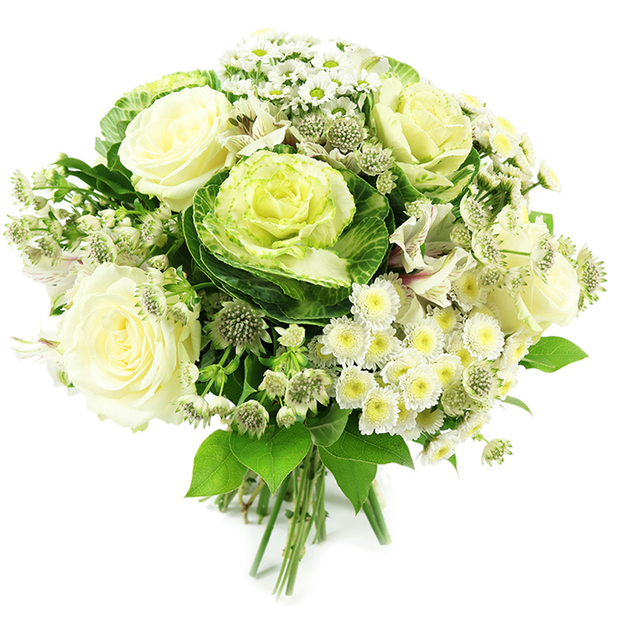 Elevate any occasion with our elegant bouquet, featuring pristine white roses, delightful chamomile, and vibrant greenery. This unique design showcases the natural beauty and sophistication of each flower, making it a memorable gift.