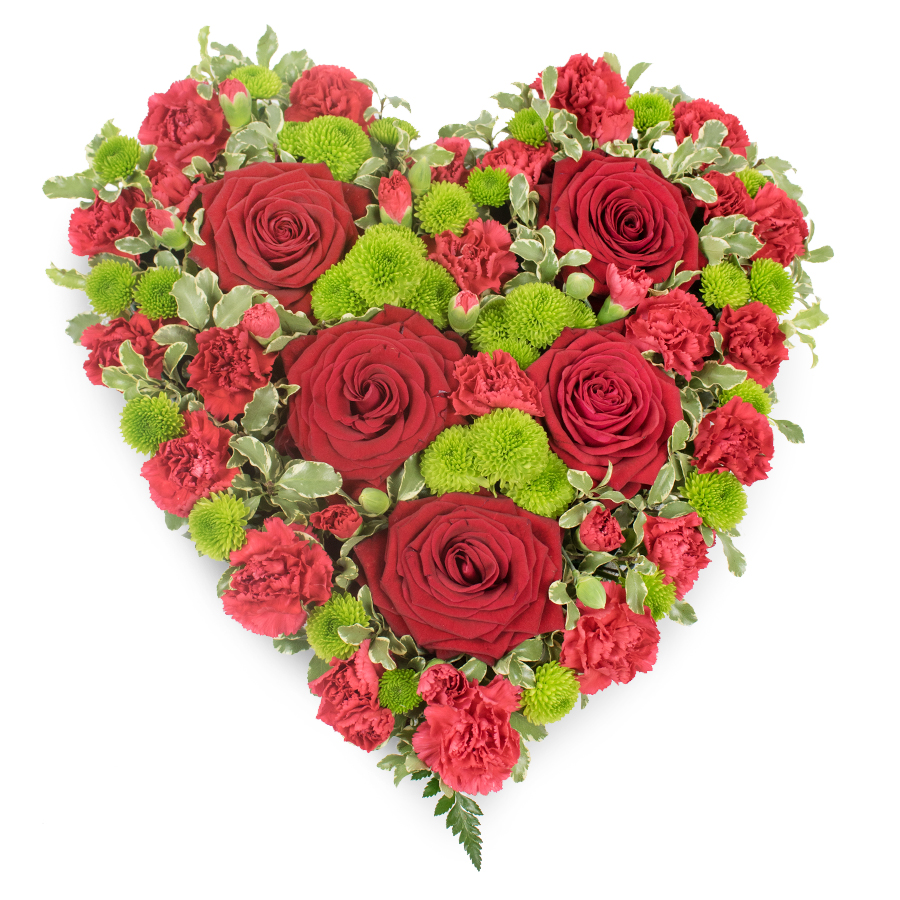 This lovely display of red roses, red carnations and mini green chrysanthemums is suitable to be sent to a funeral of a loved one to represent your warm condolences and great appreciation.