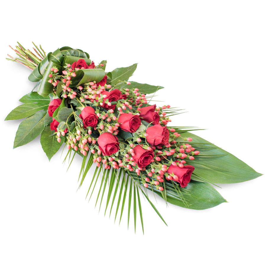 The red roses were stunning and the hypericum added a unique texture. Truly a beautiful tribute.