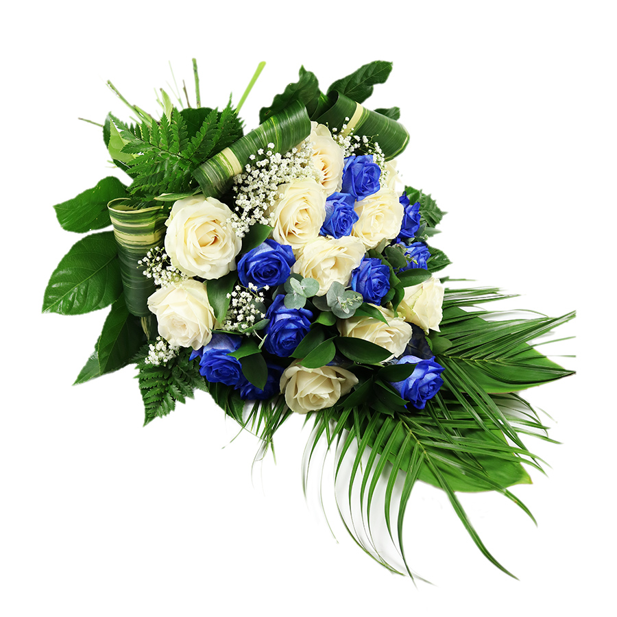 Convey your deepest sympathies with our stunning spray arrangement, featuring soft white and soothing blue roses.
