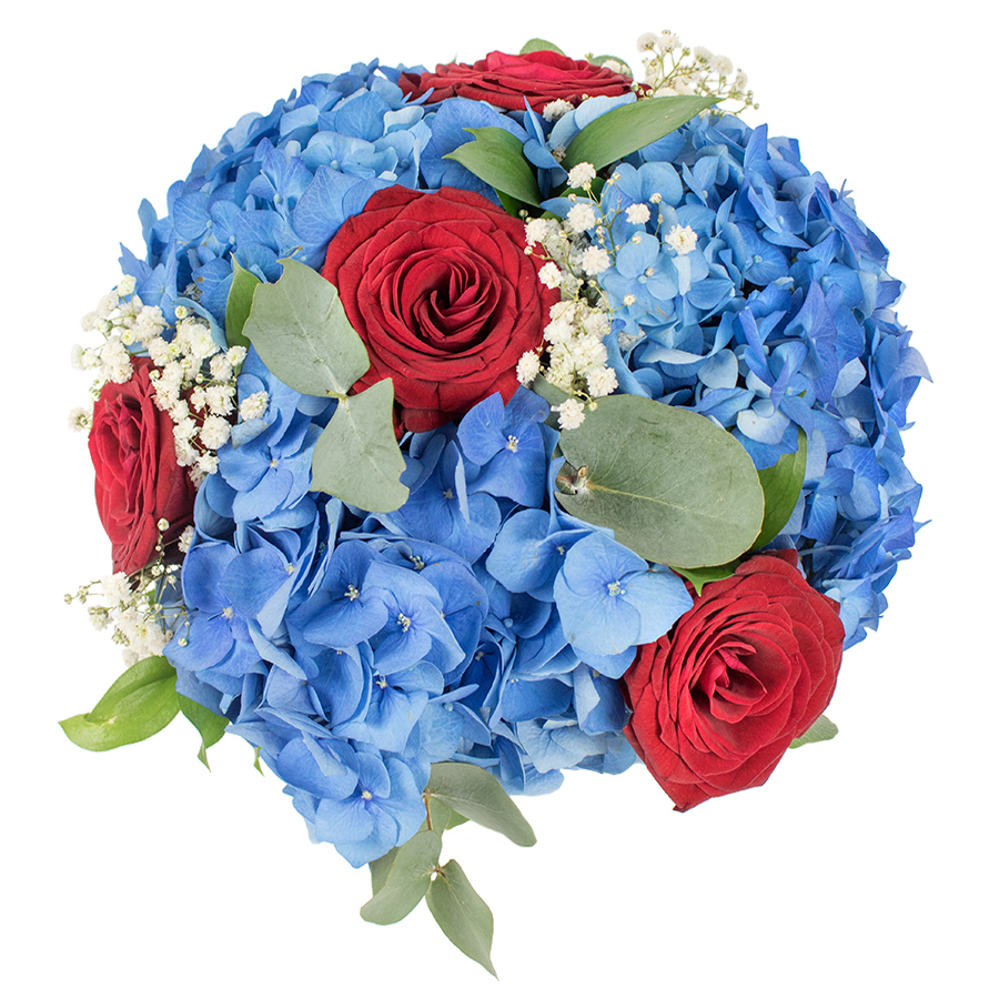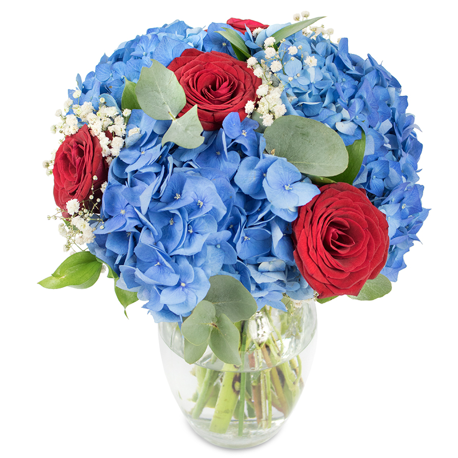 Majestic Red Roses & Blue Hydrangea Arrangement
