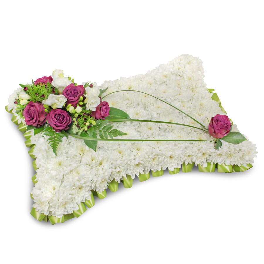 A wonderfully arranged pillow-shaped tribute consisting of white chrysanthemums, purple roses, white freesias, dianthus and bear grass which conveys a message of love and peace. It is a nice way to offer your sincere condolences to the family of the deceased and state that they will always be in your thoughts.