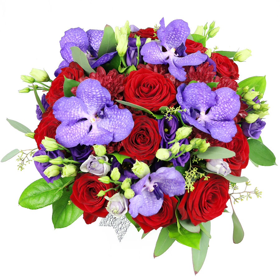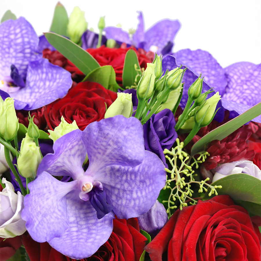 Embrace the charm of our stunning bouquet, featuring vibrant red roses and exquisite purple vanda orchids. Designed with elegance and romance, this unique arrangement is the perfect way to express your love.