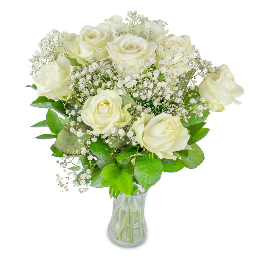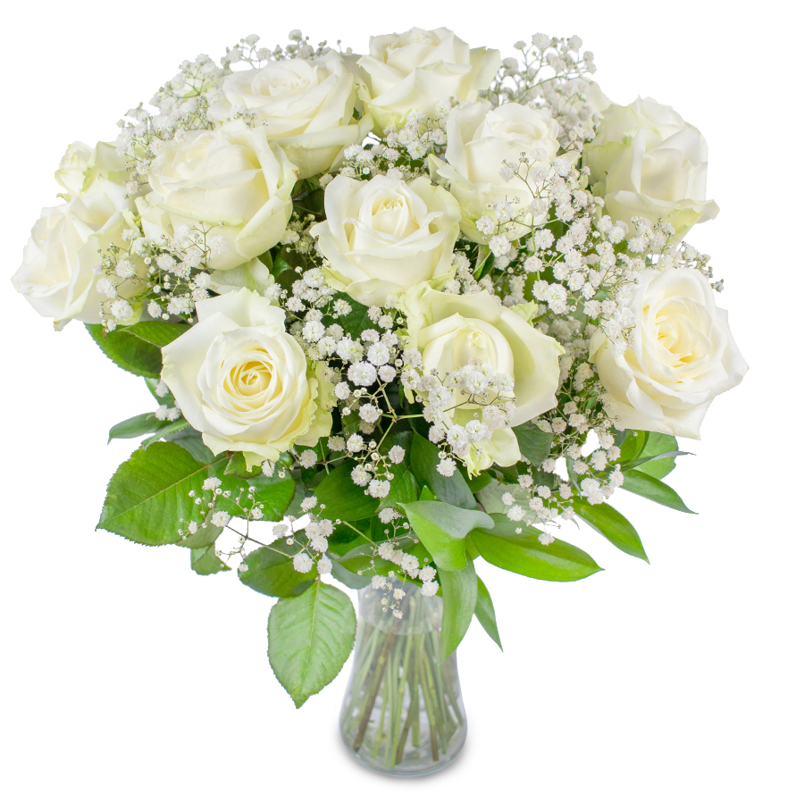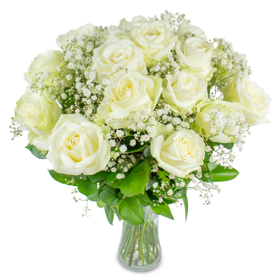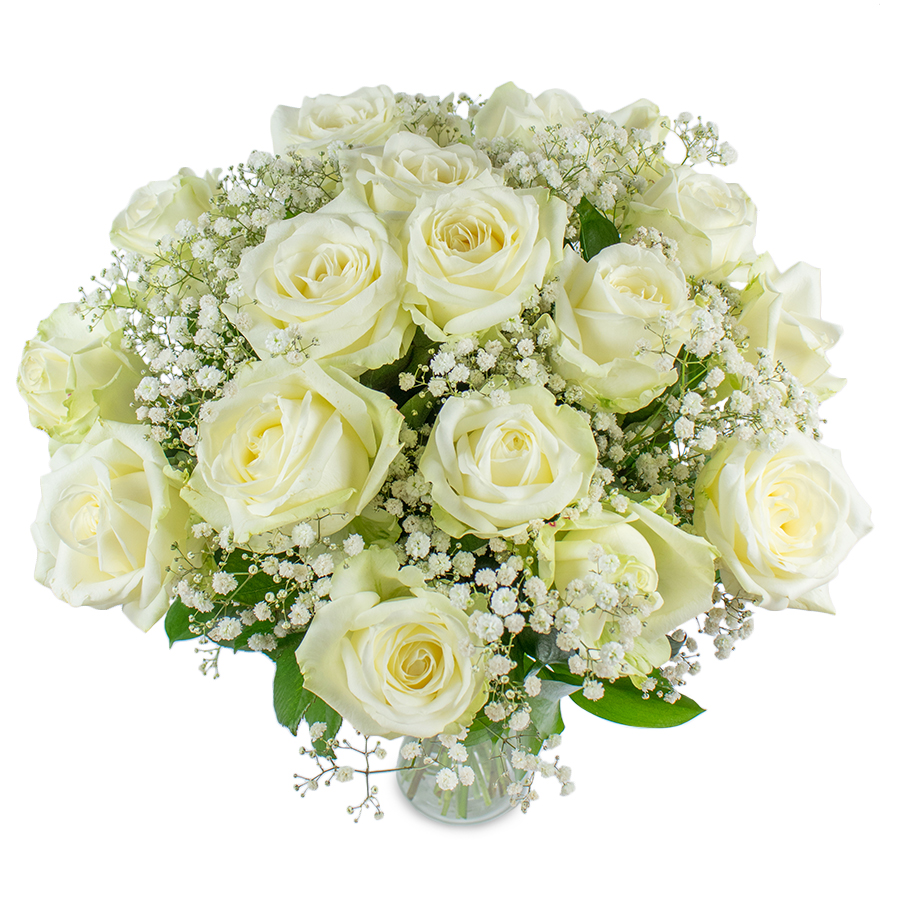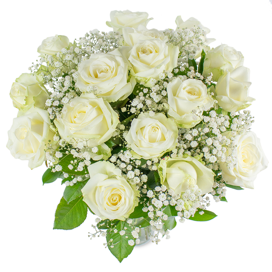 Nothing can be more elegant than the finest large-headed white roses, picked up just for you. Our exclusive bouquet featuring white roses hand-tied with gypsophila and aspidistra leaves will leave you breathless.