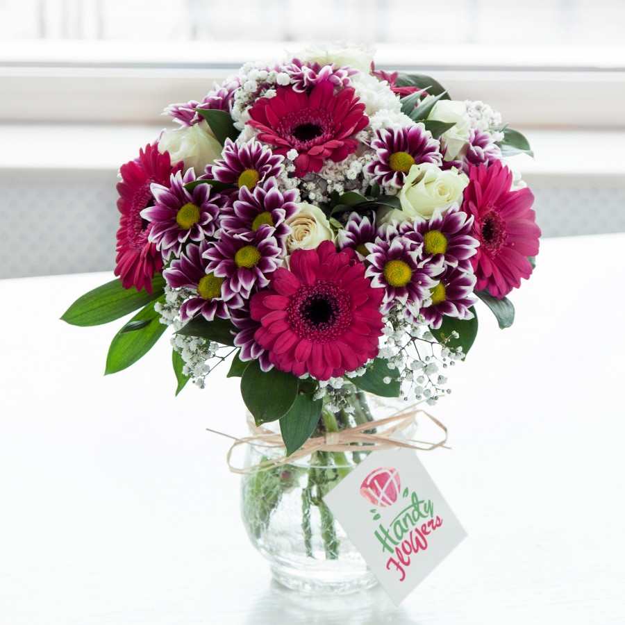 An incredibly glamorous but yet romantic selection that is a real feast for the eyes. Featuring delicately scented white roses, timmed spray chrysanthemums, pink germini and white gypsophila.