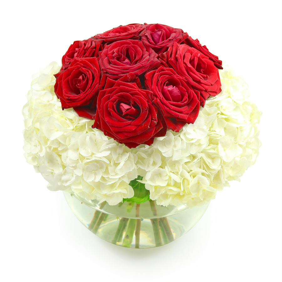 Indulge in the refined elegance of our sophisticated bouquet, showcasing lush red roses combined with graceful white hydrangeas. Each flower is hand-selected to ensure exceptional quality and lasting freshness.