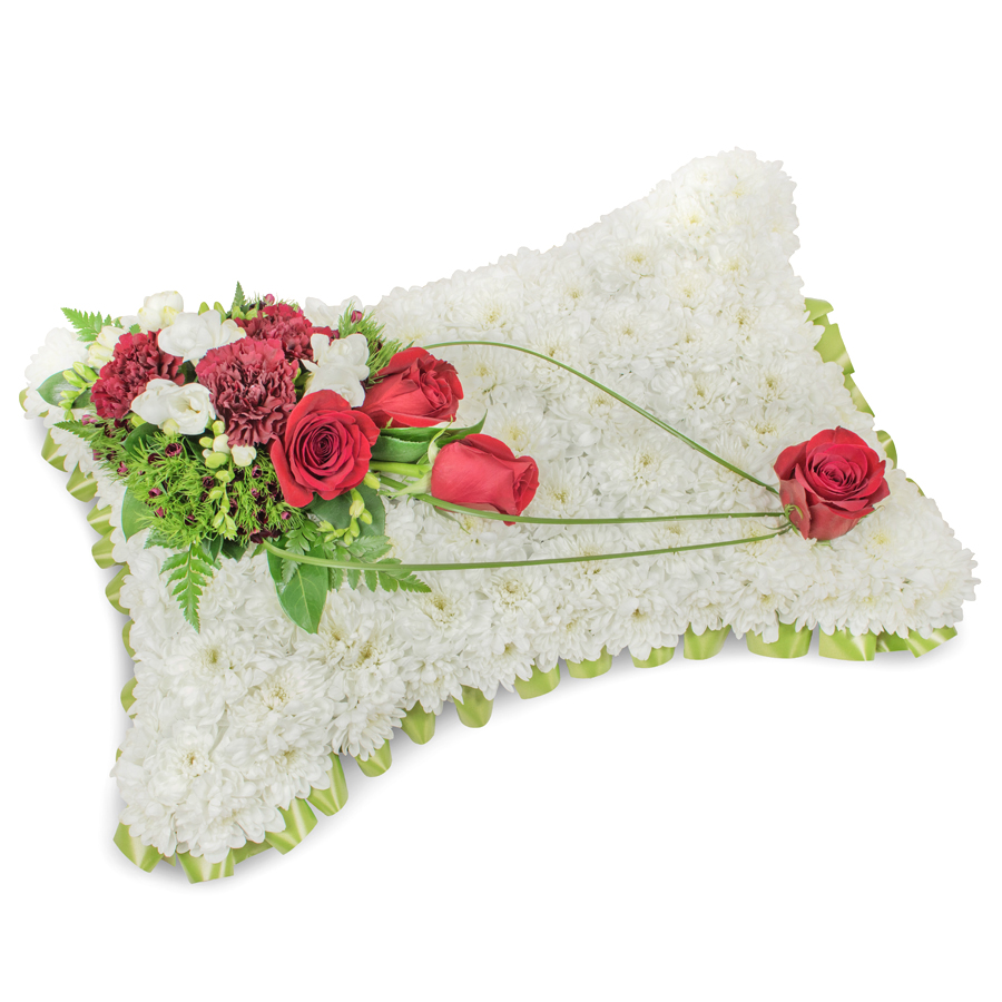 Convey your deepest sympathies with our sophisticated floral arrangement, thoughtfully designed to provide solace and beauty. This exceptional bouquet showcases white chrysanthemums, red roses, white freesias, and dark red carnations, enhanced by dianthus and bear grass.