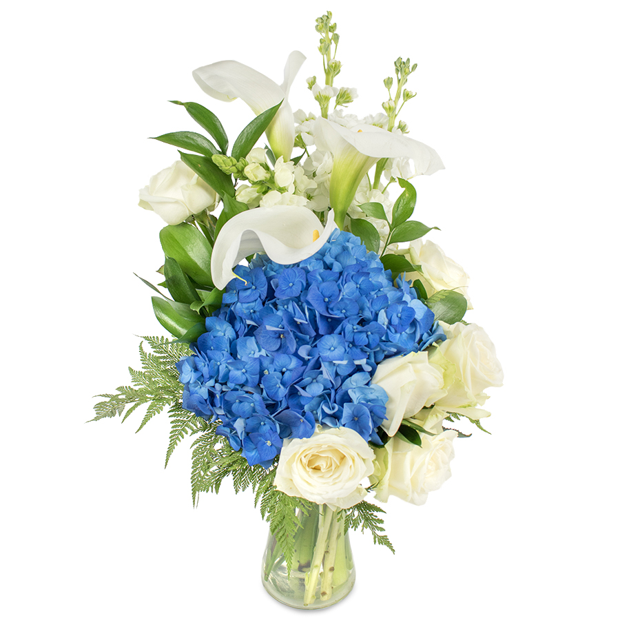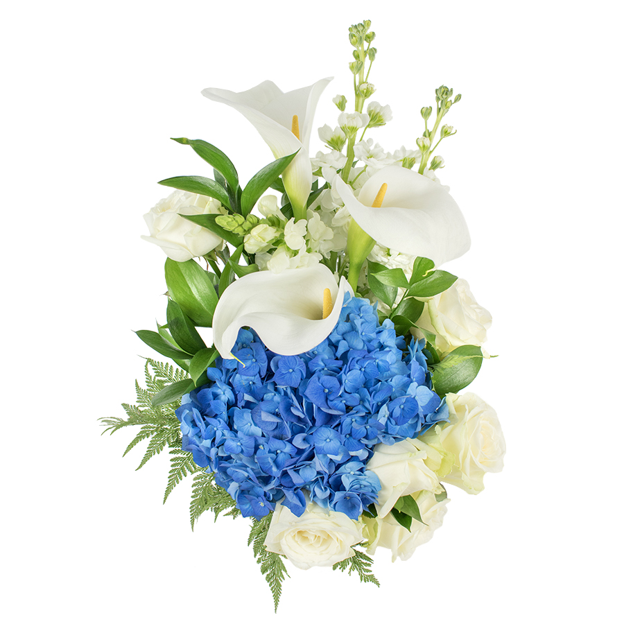 Our chic bouquet combines the purity of white calla lilies and white roses with the lushness of blue hydrangeas and the charm of white stock flowers. This unique blend creates a sophisticated and visually stunning display.